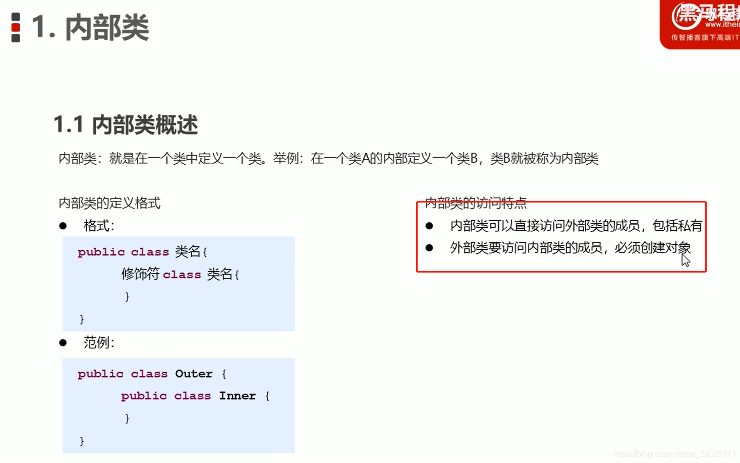 一般内部类是私有的,为了隐藏保护的内容。但是可以通过外部类的方法去构造内部类的对象。(间接调用)